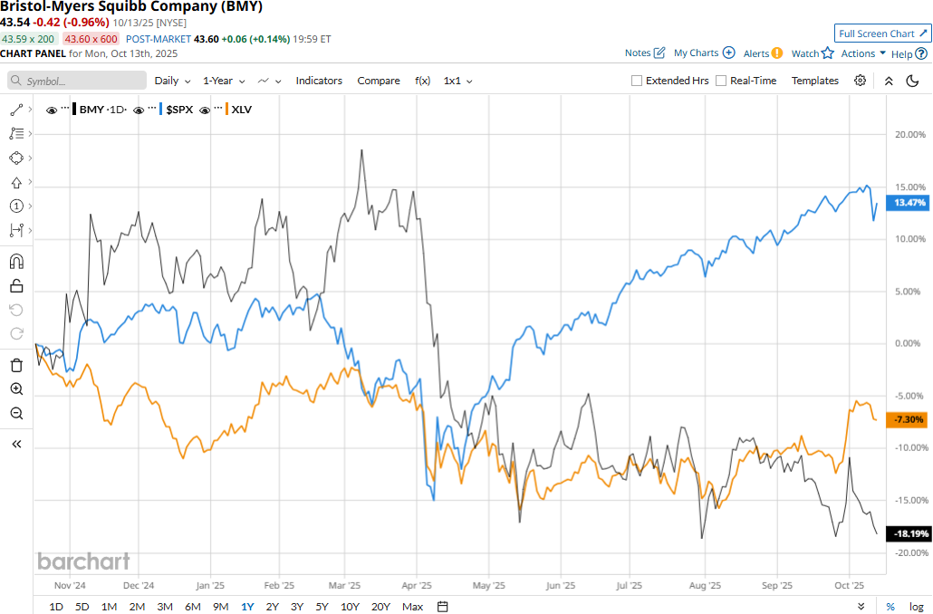 BMY stock prices have plummeted 16.6% over the past 52 weeks, notably underperforming the Health Care Select Sector SPDR Fund’s (XLV) 7.8% decline and the S&P 500 Index’s ($SPX) 14.4% gains during the same time frame.