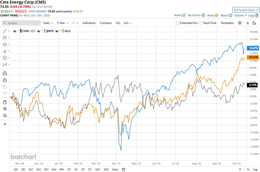 CMS stock prices have gained 6.1% over the past 52 weeks, notably lagging behind the Utilities Select Sector SPDR Fund’s (XLU14.7% surge and the S&P 500 Index’s ($SPX14.4% gains during the same time frame.