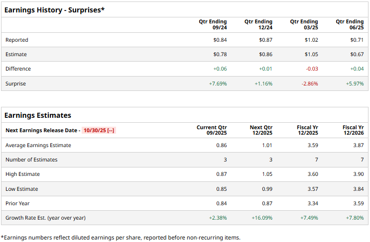 The utilities giant is expected to announce its third-quarter results by the end of October. Ahead of the event, analysts expect CMS to report an adjusted profit of $0.86 per share, up 2.4% from $0.84 per share reported in the year-ago quarter. While the company has missed the Street’s bottom-line estimates once over the past four quarters, it has surpassed the projections on three other occasions.